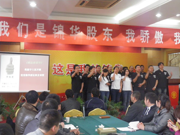 上午一個重要的環節就是——陳述承諾,表達承諾!所有在場的股東,都用自己的方式,闡述了自己在2011年,作為錦華股東,所作出的承諾——從馬鞍山走回南京、總部23樓爬2個來回、喊1000遍敬業口號、自罰不菲金額。