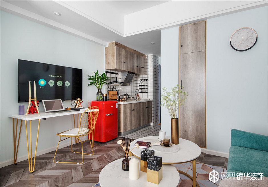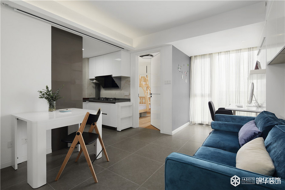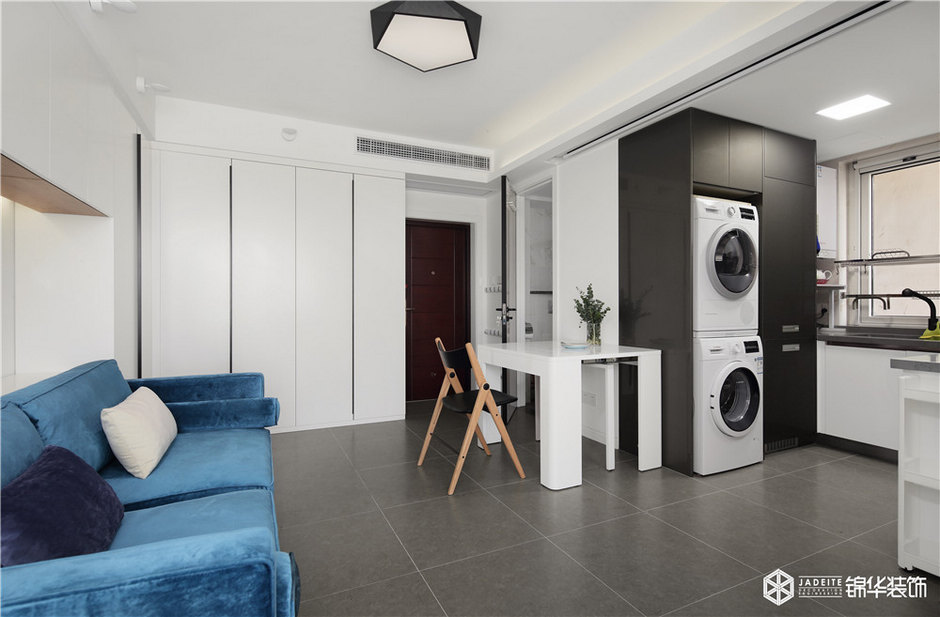 雖然本案是一個(gè)只有50平的公寓,但該有的功能全部具備,比如大型綜合儲(chǔ)物柜、全景書(shū)房、觀景飄窗閱讀臺(tái)、強(qiáng)大功能的廚房。