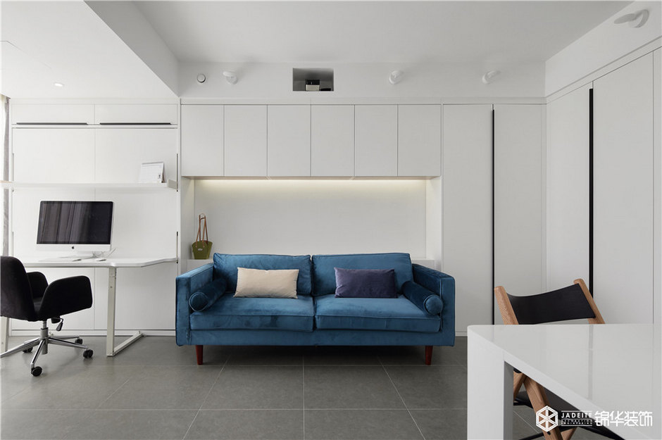 ▲客廳與陽(yáng)臺(tái)打通,兼具書(shū)房與客廳功能,頂面吊柜增加整體收納!