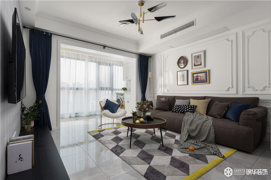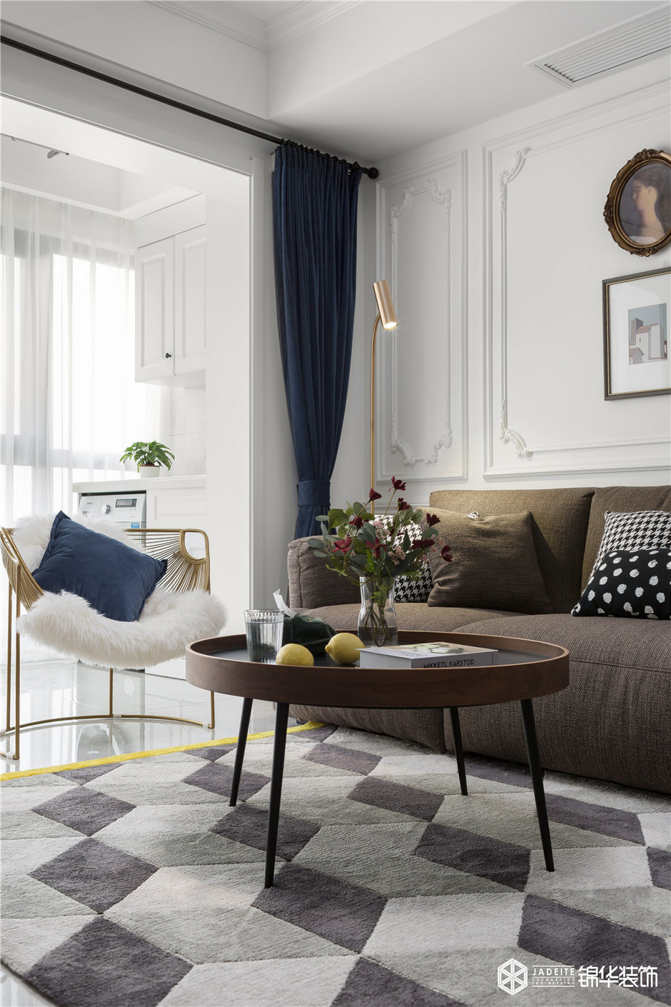 將陽(yáng)臺(tái)空間納入室內(nèi),但因?yàn)樵?yáng)臺(tái)的梁無(wú)法拆除,如果將其全部遮蓋,客廳的整體高度會(huì)降低,設(shè)計(jì)師機(jī)智地做了一個(gè)美式經(jīng)典的格子頂,美觀實(shí)用,然后加已線條做出層次使客廳空間看起來(lái)高挑。