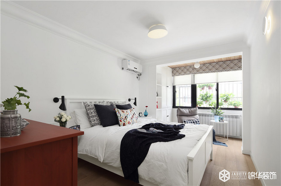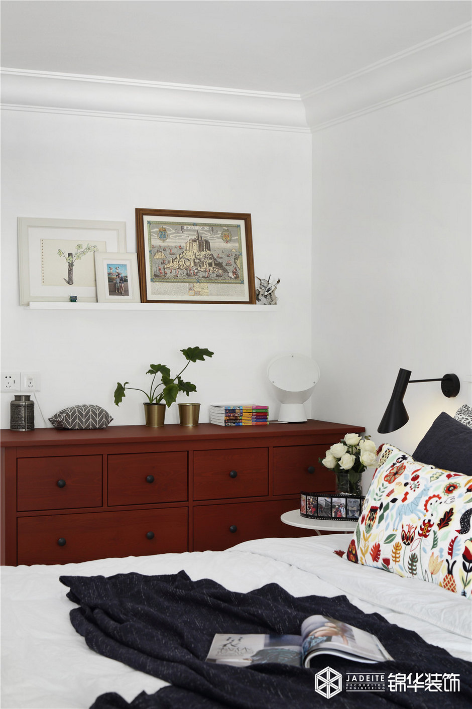 整個(gè)臥室空間以白色調(diào)為主,輔以恰到好處的醬紅色、木色等,再搭配以其他裝飾品等,讓整個(gè)空間看起來(lái)既寬敞舒適又格調(diào)十足。