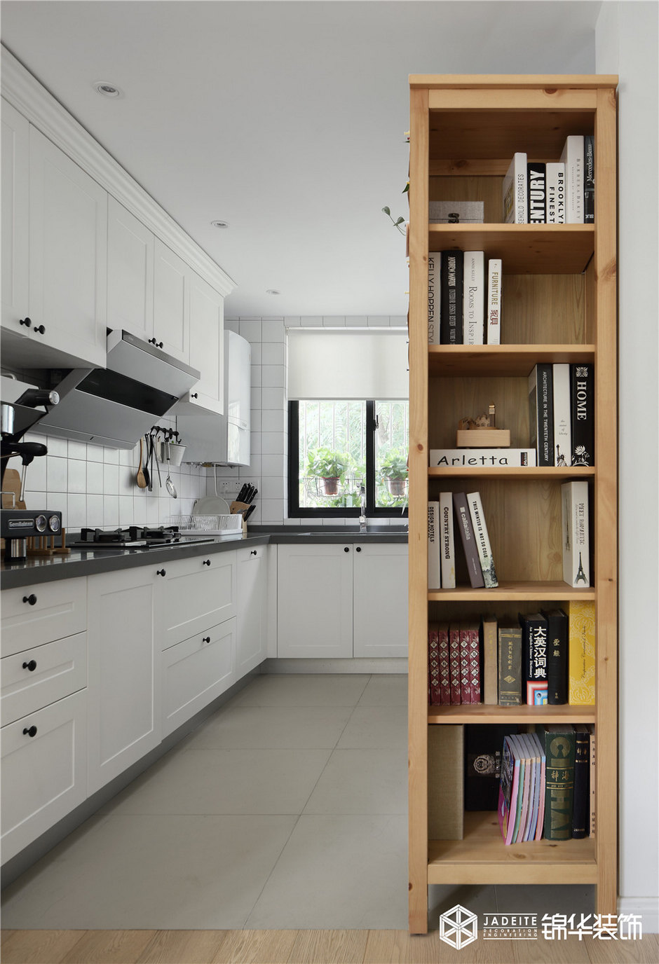 廚房敞開(kāi)的設(shè)計(jì),讓空間顯得沒(méi)有那么的局促,上方的壁櫥大大增加了收納功能。