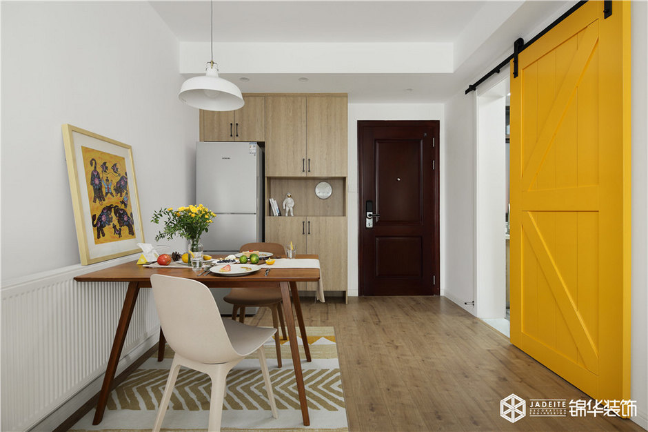 ▲明黃色谷倉(cāng)門,是空間的視覺(jué)亮點(diǎn)之一,它作為廚房和客餐廳的分界線,既有效地節(jié)省了空間占比,又十分具有趣味性!